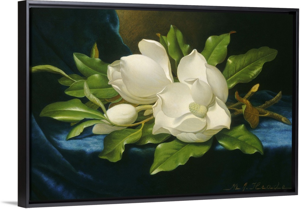 <p>Giant Magnolias on a Blue Velvet Cloth, by Martin Johnson Heade, 1890, American oil painting. Landscape and flower painter Heade moved to Florida in his late career, when he painted this work. Railroad magnate Henry Morrison Flagler, regularly purchased h</p>
