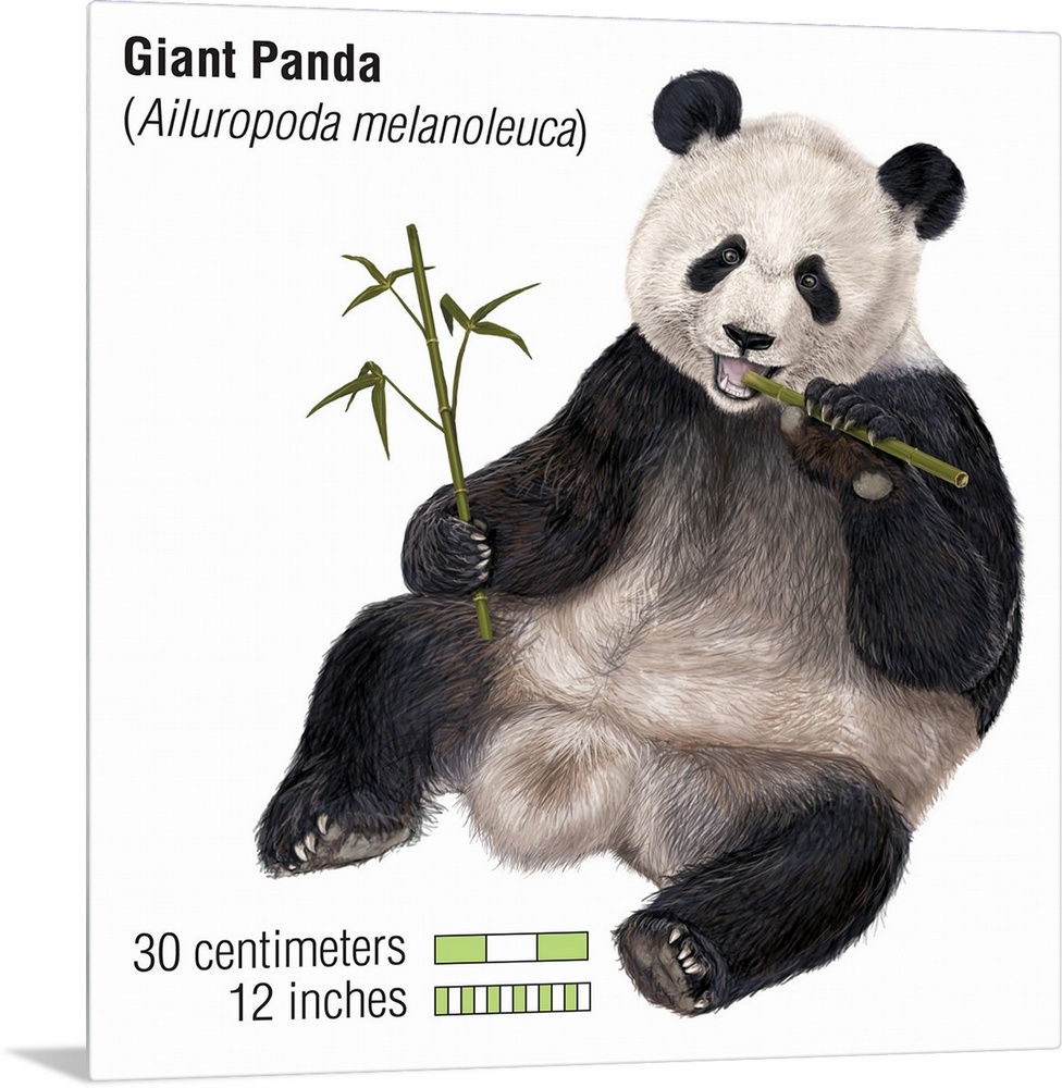 <p>An illustration from Encyclopaedia Britannica of a Giant Panda eating bamboo, showing the scale of the animal.</p>