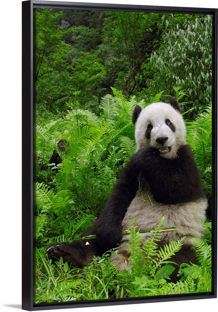<p>Giant panda (Ailuropoda melanoleuca) in its environment Family: Ailuropodidae.Wolong China Conservation and Research Center for the Giant Panda within Wolong Reserve. Sichuan Province.CHINARANGE: Temperate bamboo forests of altitudes between 6,500 and 10,000 feet. Central Sichuan, South Gansu, East Qinling and in Shaanxi Provinces of China.ENDANGERED SPECIESLess than 1000 animals remain in the wild. Even the death penalty does not deter people from hunting these animals, but they are mostly endangered due to habitat loss.They consume about 45 pounds of a specific type of bamboo per day as well as some mosses, fungi and even small rodents. Males weigh: 85-125kg's and females weigh: 70-100 kg's. They live 10-15 years in the wild and up to 30 in captivity. Their natural predators are leopards.</p>