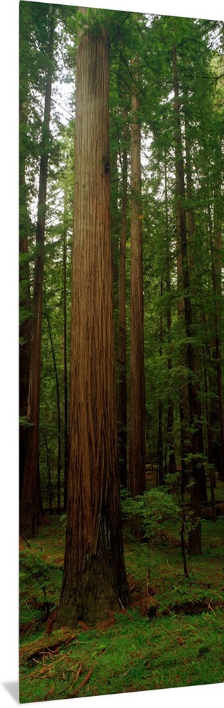 <p>Vertical photograph on a big canvas of tall redwood trees surrounded by green foliage in the Giants Redwood National Park in Northern California.</p>