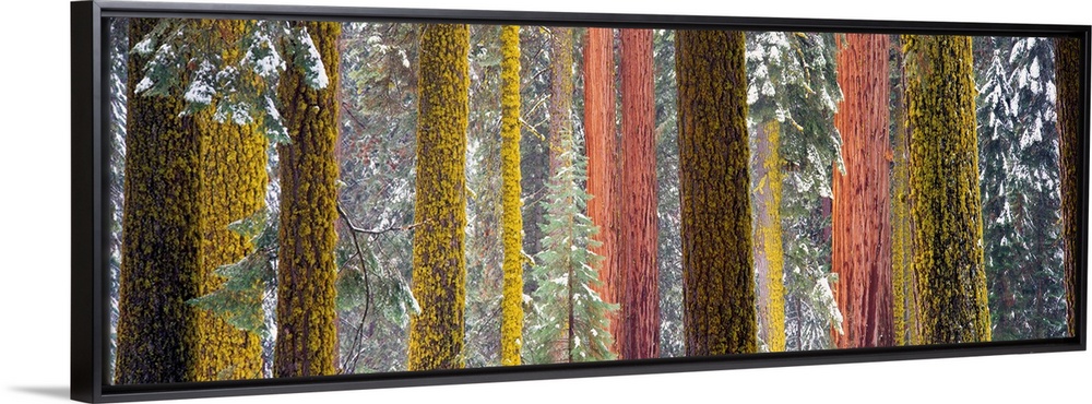 <p>Panoramic photograph shows a forest within the Western United States that is filled with large redwood trees. Located on the sides of some of the trees, colorful moss can be seen growing, while a lot of the branches on the trees have been recently covered with snow.</p>