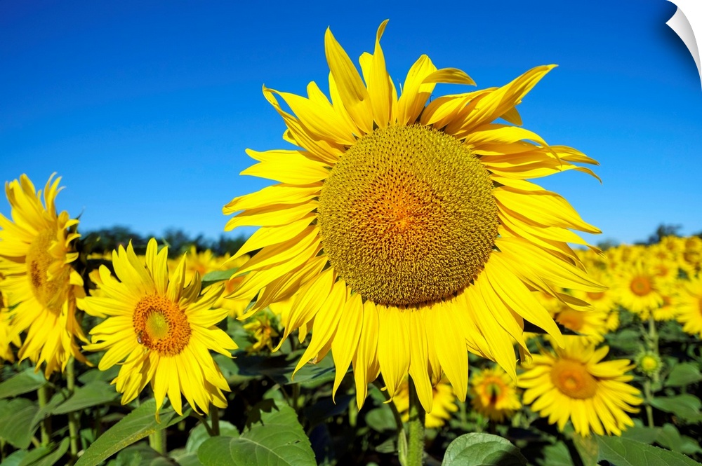 <p>Giant yellow sunflowers in full bloom, Oraison, Alpes-de-Haute-Provence, Provence-Alpes-Cote d'Azur, France.</p>