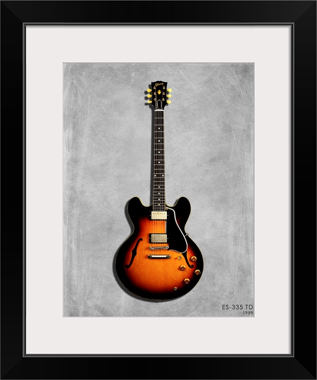 <p>Photograph of a Gibson ES335 59 printed on a textured background in shades of gray.</p>