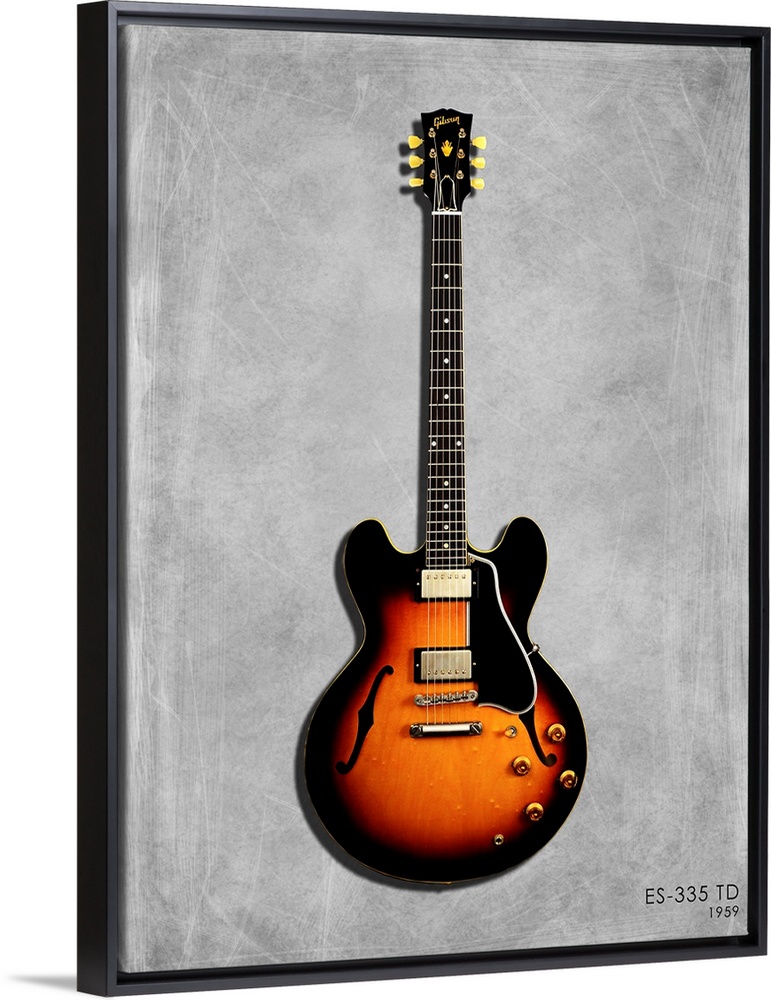 <p>Photograph of a Gibson ES335 59 printed on a textured background in shades of gray.</p>