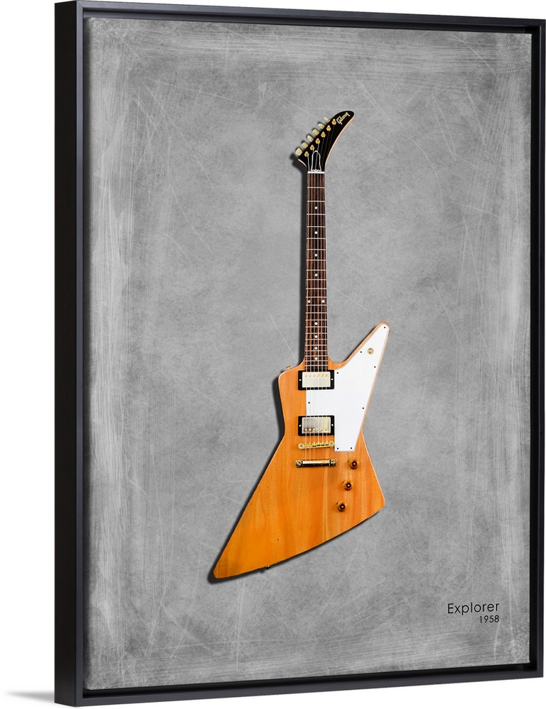 <p>Photograph of a Gibson Explorer 58 printed on a textured background in shades of gray.</p>