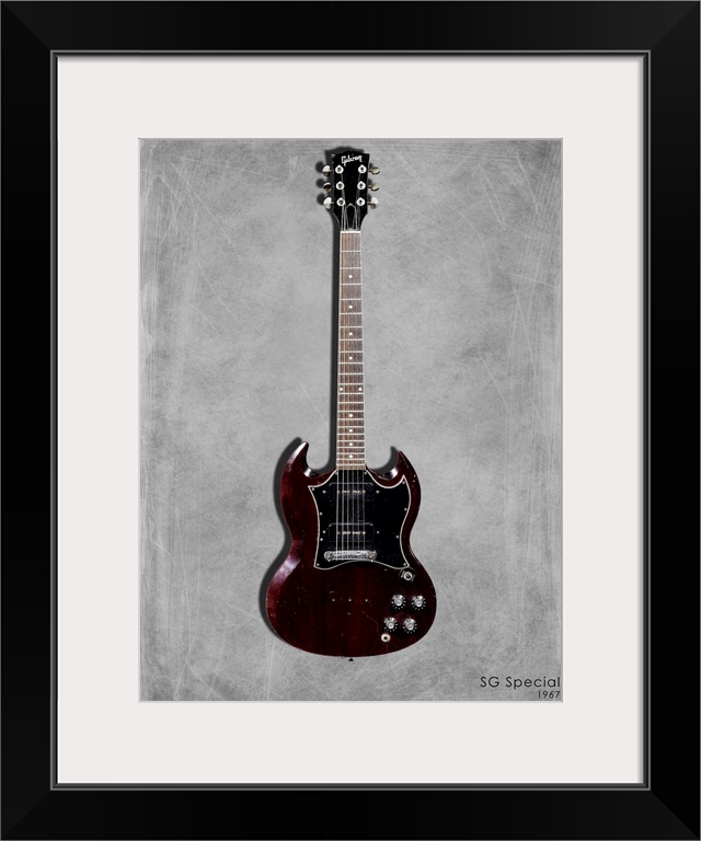 <p>Photograph of a Gibson SG Special 1967 printed on a textured background in shades of gray.</p>