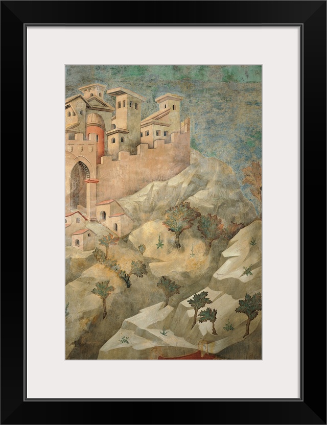 <p>The Gift of the Mantle, by Giotto, 1297 - 1299, 13th Century, fresco, cm 270 x 230 - Italy, Umbria, Perugia, Assisi, Upper Basilica of San Francesco, nave. Detail. Rocky landscape city town towered citadel stronghold fortification buildings architecture c</p>