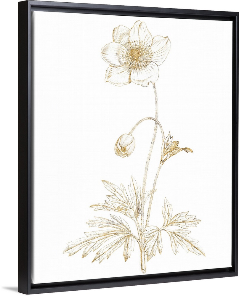 <p>Gold illustration of an anemone and flower bud on a solid white background.</p>