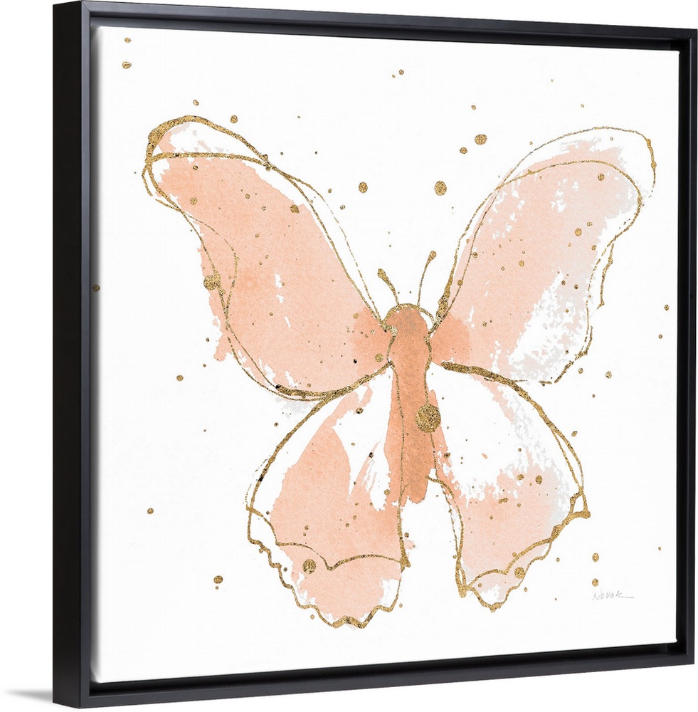 <p>A square watercolor painting of a peach butterfly outlined in gold with gold splatters.</p>
