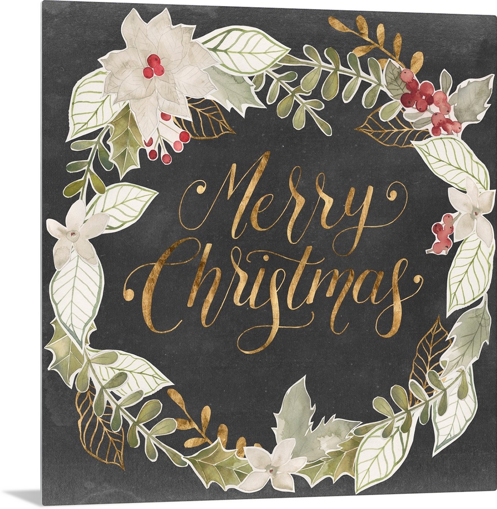 <p>"Merry Christmas" in gold surrounded by a wreath of muted green shades with gold accents.</p>