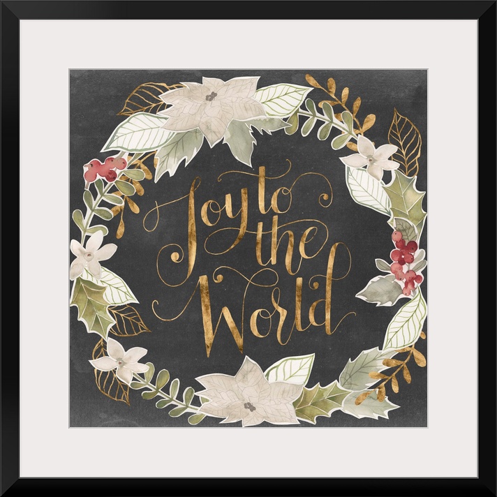 <p>"Joy To The World" in gold surrounded by a wreath of muted green shades with gold accents.</p>