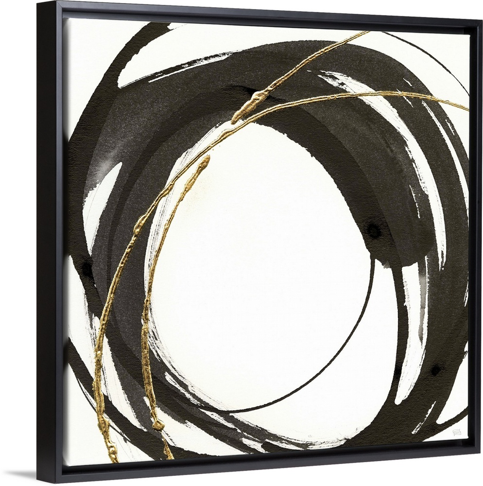 <p>Abstract painting with black and gold circles layered on top of each other on a white, square background.</p>