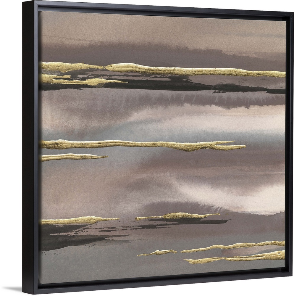 <p>Square watercolor painting with pink, purple, and gray fading layers and metallic gold and black horizontal overlays.</p>