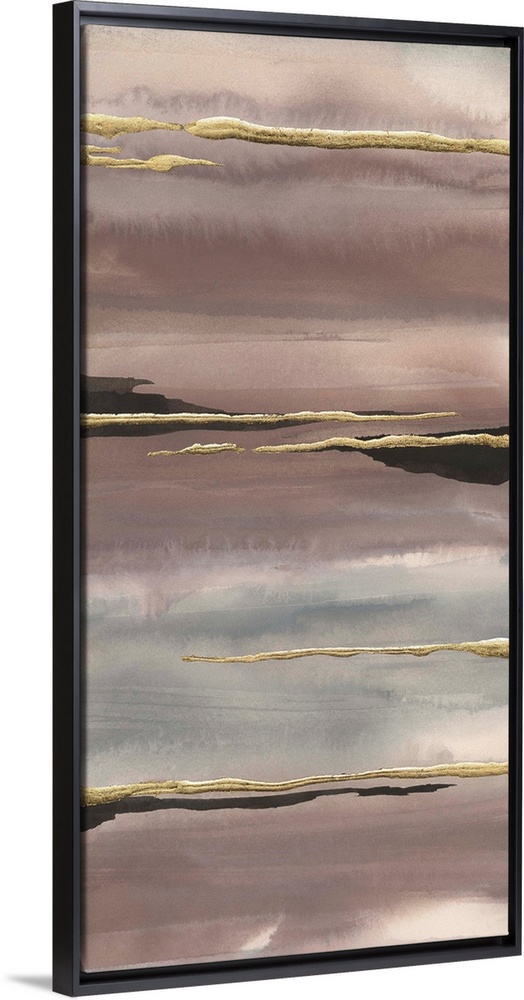 <p>Vertical watercolor painting with pink, purple, and gray fading layers and metallic gold and black horizontal overlays.</p>