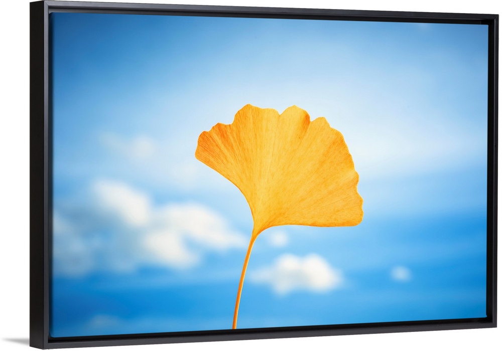 <p>Yellow gingko leaf in front of a blue sky</p>