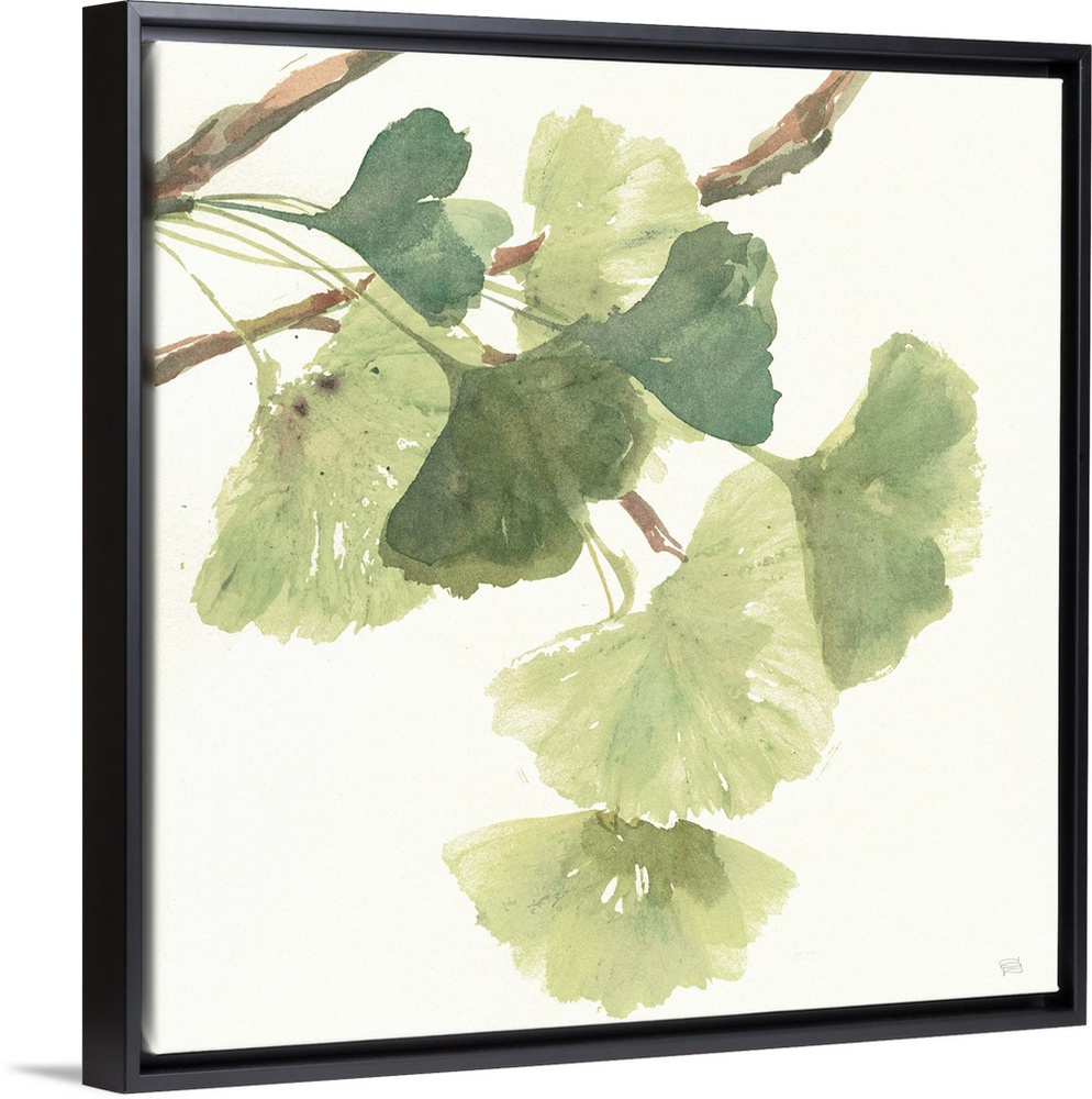 <p>Square watercolor painting of a branch with ginkgo leaves in shades of green on a white background.</p>