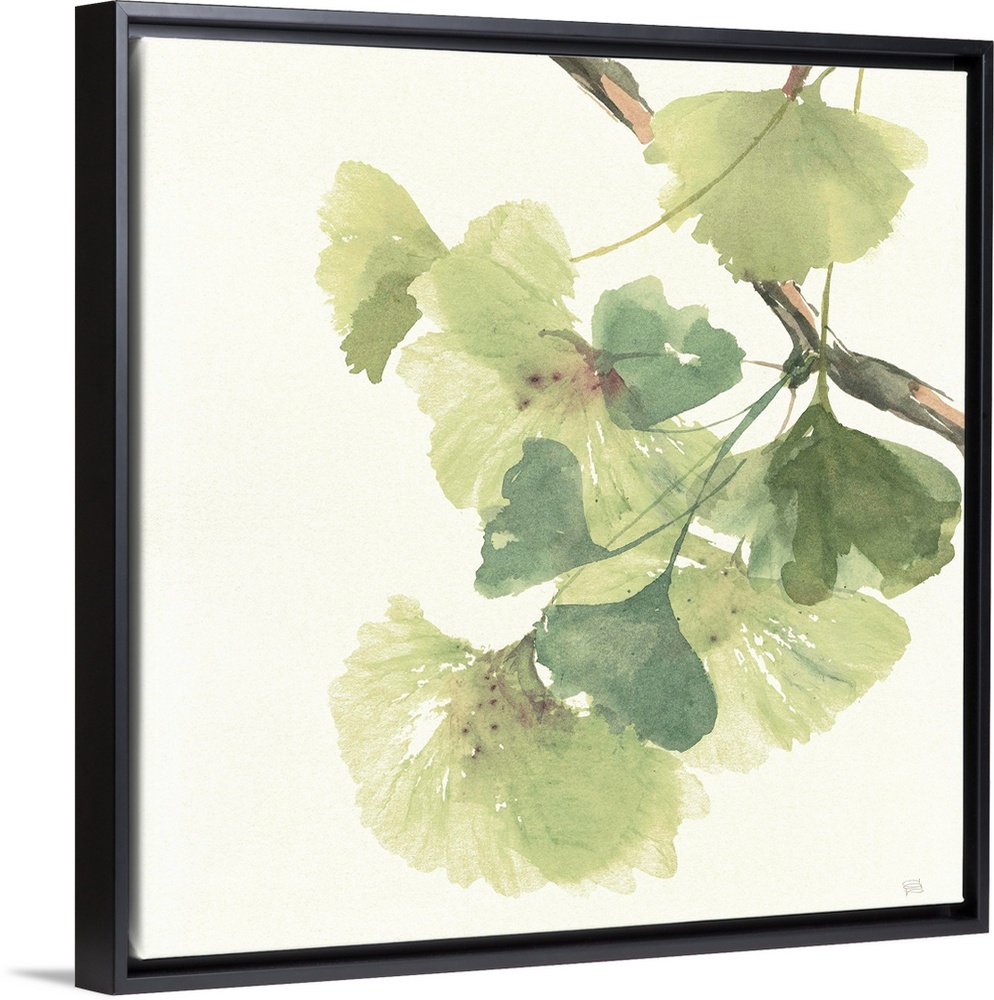 <p>Square watercolor painting of a branch with ginkgo leaves in shades of green on a white background.</p>