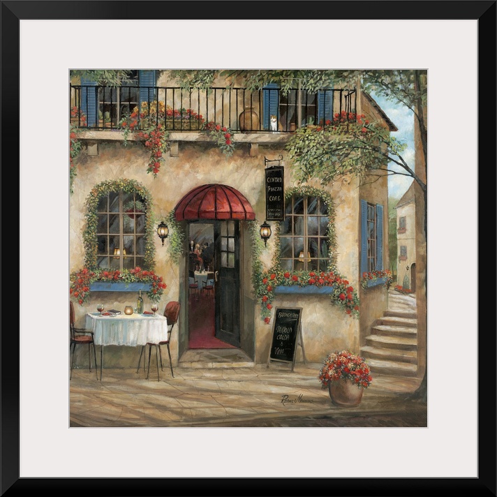 <p>A contemporary artwork of an European street scene decorated in flowers with a pizzeria.</p>