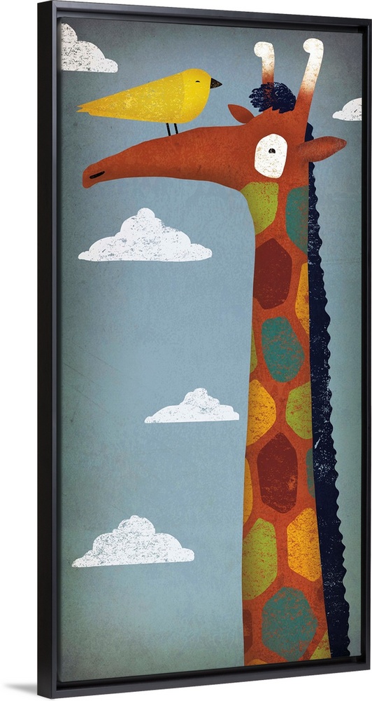 <p>Cute illustration of a giraffe with colorful spots and a yellow bird on its nose.</p>
