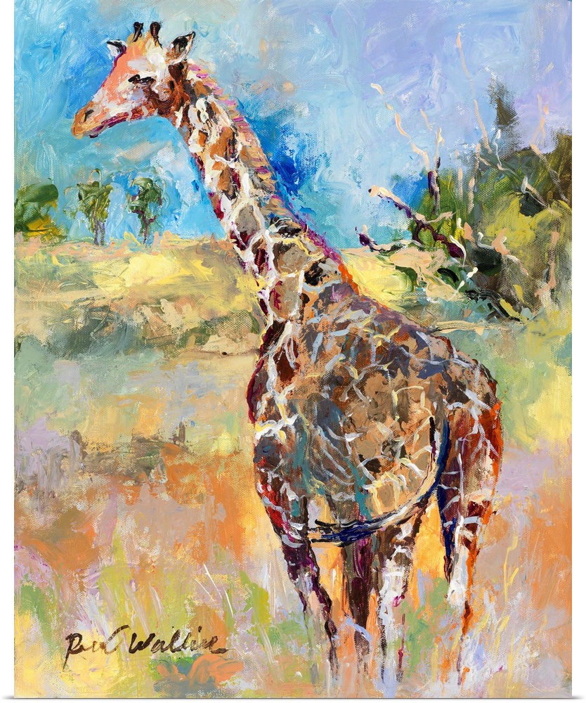 <p>Abstract painting of a giraffe in its habitat.</p>