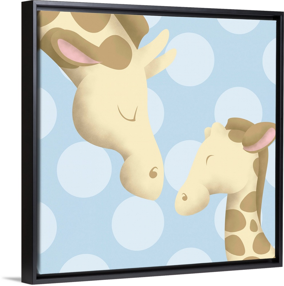 <p>Nursery art of a mother giraffe and her baby on a blue polka-dot background.</p>
