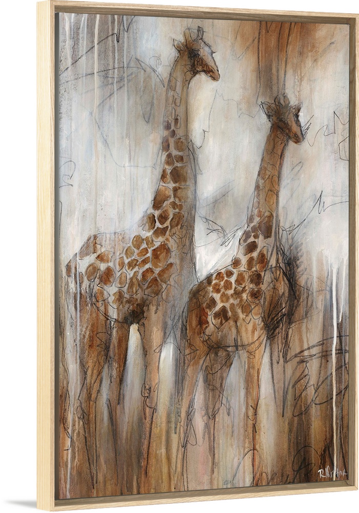 <p>Illustrative painting of two giraffes done in varying shades of grayish-brown.</p>