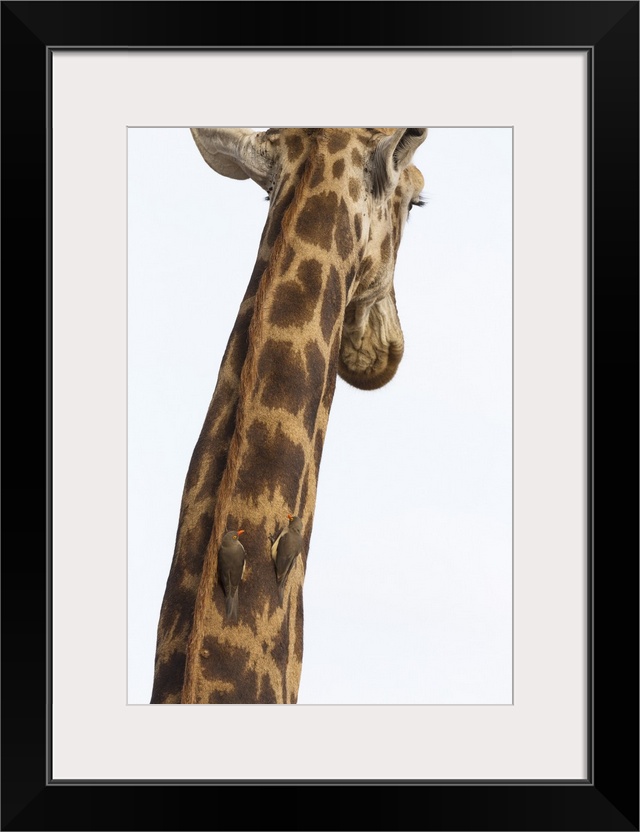 <p>Giraffe (Giraffa camelopardalis) with redbilled oxpeckers (Buphagus erythrorhynchus), Kruger National Park, South Africa, Africa</p>