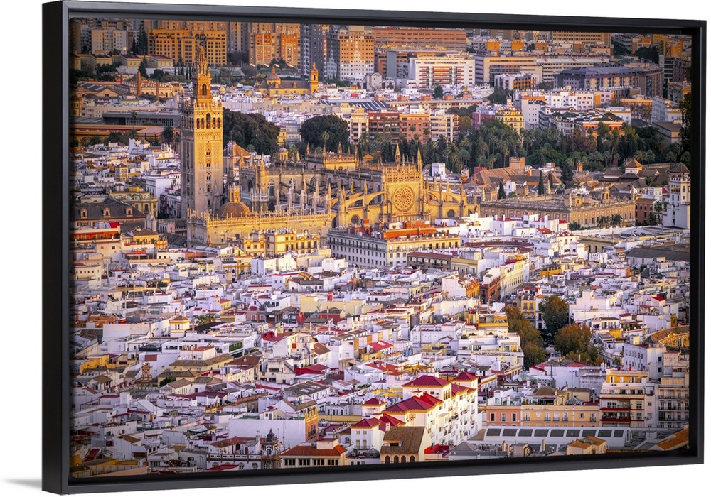 <p>Aerial view of Seville downtown with the Giralda tower, the Cathedral, and the Archivo de Indias building, among other landmarks, in Spain.</p>
