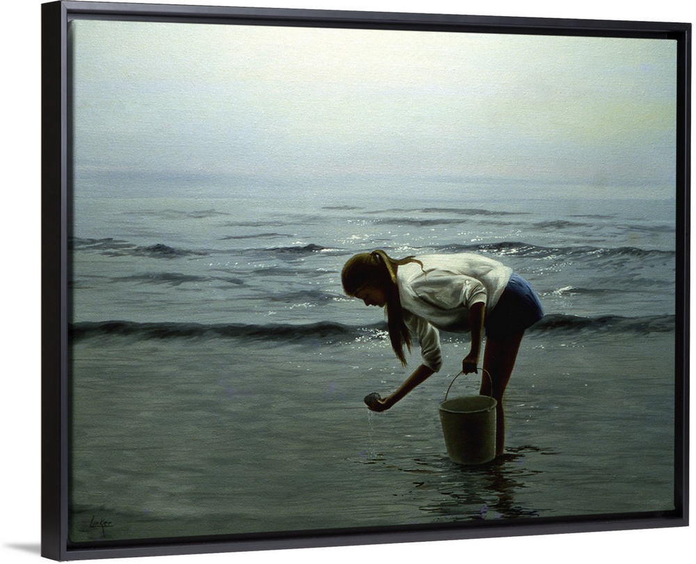 <p>Contemporary painting of a young woman on the beach searching for seashells.</p>