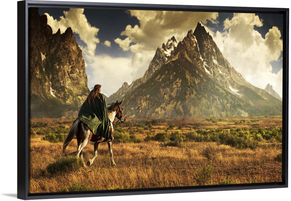 <p>Young woman with long hair wearing dark green cloak rides paint horse over dry fields toward tall, stormy mountains.</p>