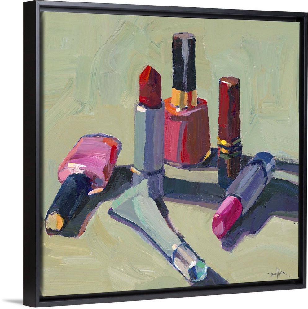 <p>Contemporary painting of a different lipstick liners and nail polishes.</p>