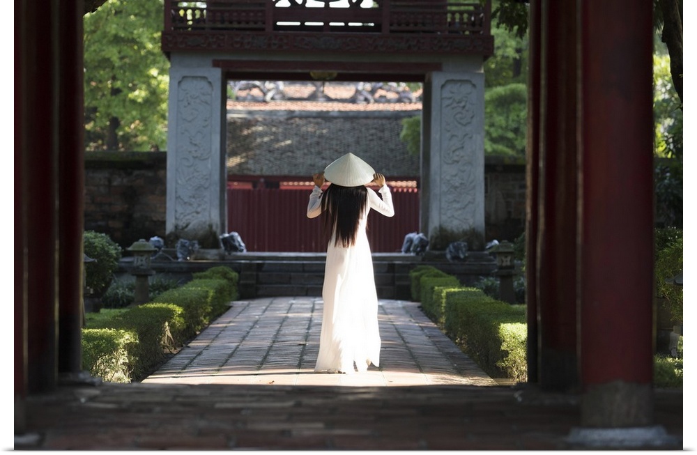 <p>Girl wearing Ao Dai dress and Non La conical hat, Temple of Literature, Hanoi, Vietnam</p>