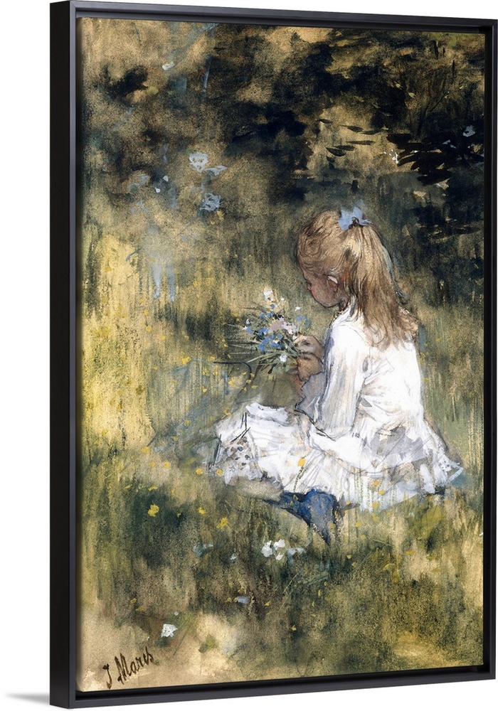 <p>Girl with Flowers on the Grass, by Jacob Maris, 1878, Dutch watercolor painting, drawing with chalk. A girl in a white dress seated on the ground, holding a bouquet of wild flowers. The girl is probably the artist's daughter.</p>