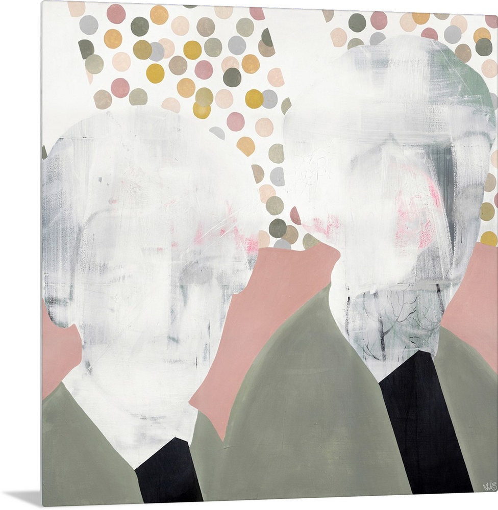 <p>A square modern contemporary portrait of two people with faded detail in their faces.</p>