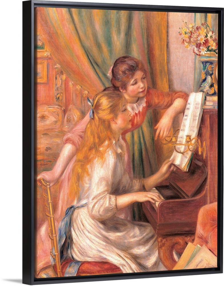 <p>Girls at the Piano, by Pierre-Auguste Renoir, 1892, 19th Century, oil on canvas, cm 116 x 90 - France, Ile de France, Paris, Muse dOrsay, R.F. 755. All. Girls at the piano playing score vase flowers dress ribbon azure light blue curtain room chair long ha</p>