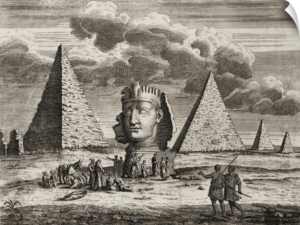 <p>Giza, Egypt. Pyramids And Sphinx As Imagined By 18th Century Artist. (From 18th Century Print) Engraved By J. Clark 1735.</p>