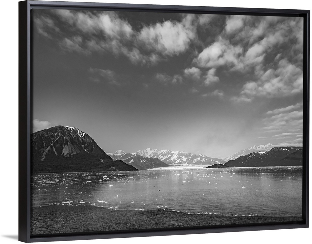 <p>Luminous black and white image of glacier mountains rising around a glacier base surrounded by artic ocean under dramatic sky and clouds. Landscape horizontal version.</p>