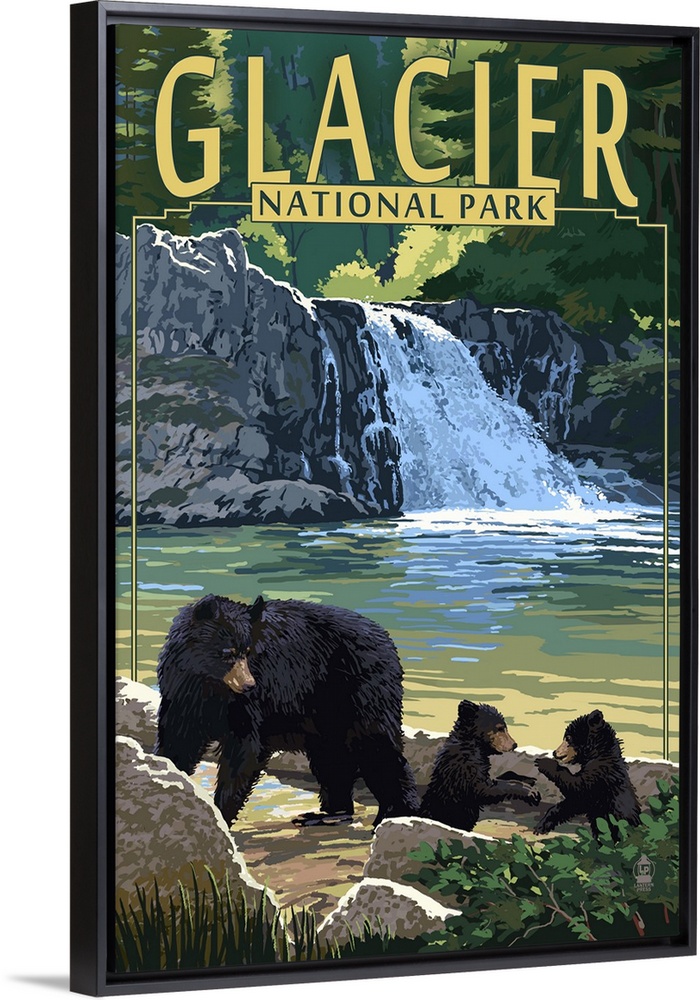 <p>Glacier National Park, Bear Family and Waterfall</p>