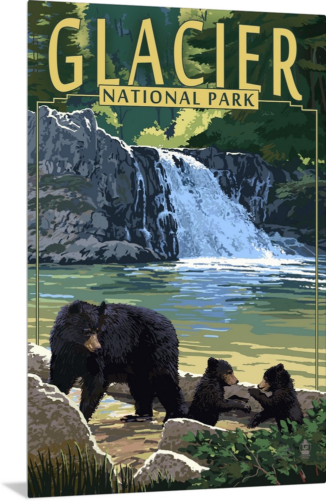 <p>Glacier National Park, Bear Family and Waterfall</p>