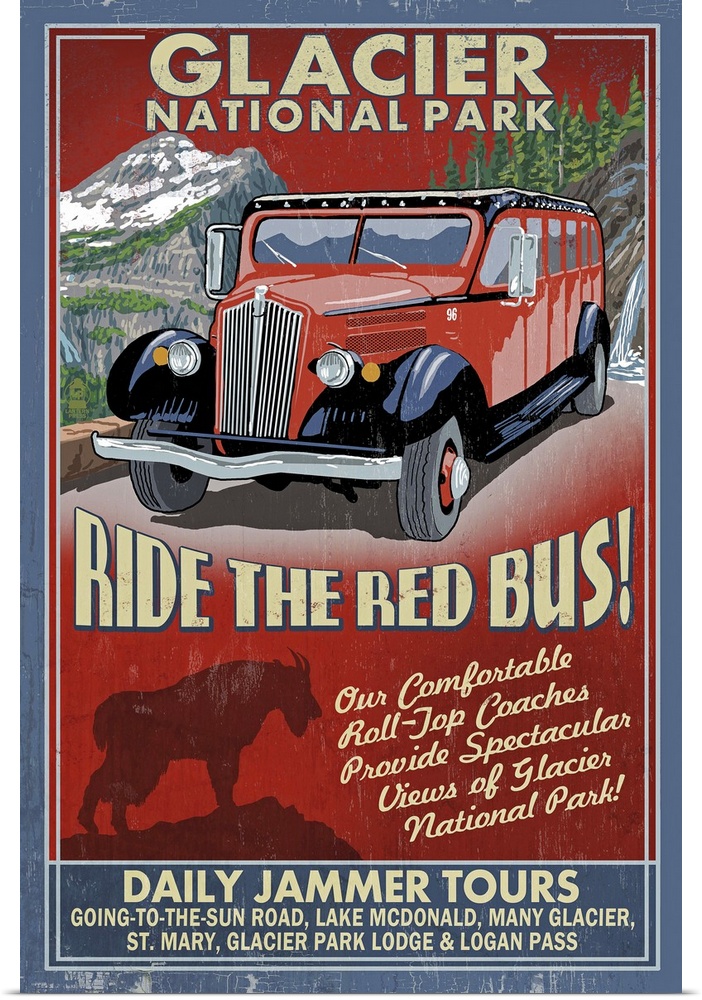 <p>Retro stylized art poster of a vintage sign with a red mountain touring bus.</p>
