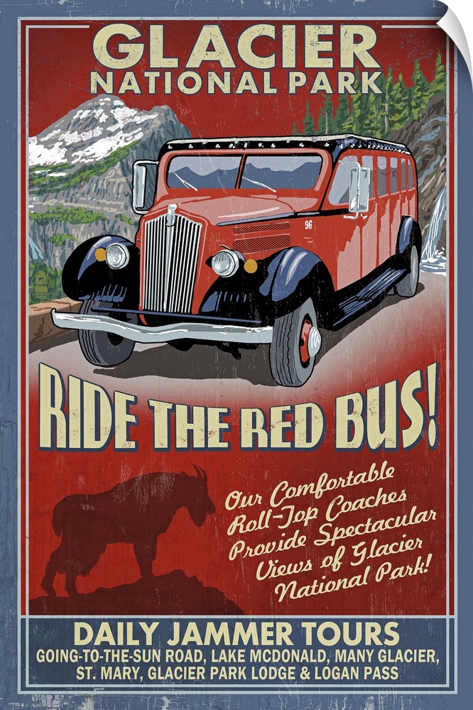 <p>Retro stylized art poster of a vintage sign with a red mountain touring bus.</p>