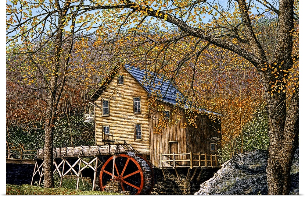 <p>Contemporary painting of a watermill in an autumn landscape.</p>