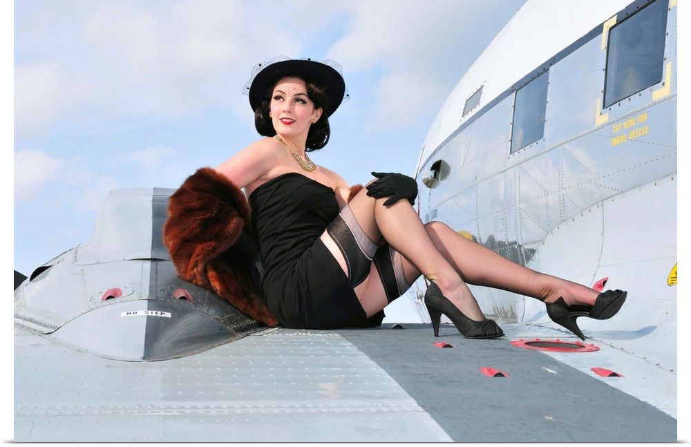 <p>Glamorous woman in 1940's style attire sitting on a vintage aircraft.</p>