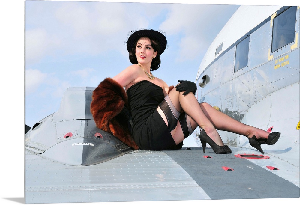 <p>Glamorous woman in 1940's style attire sitting on a vintage aircraft.</p>
