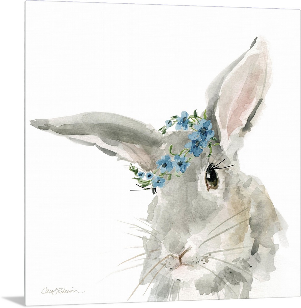 <p>Cute watercolor painting of a gray rabbit wearing a blue flower crown on a solid white, square background.</p>