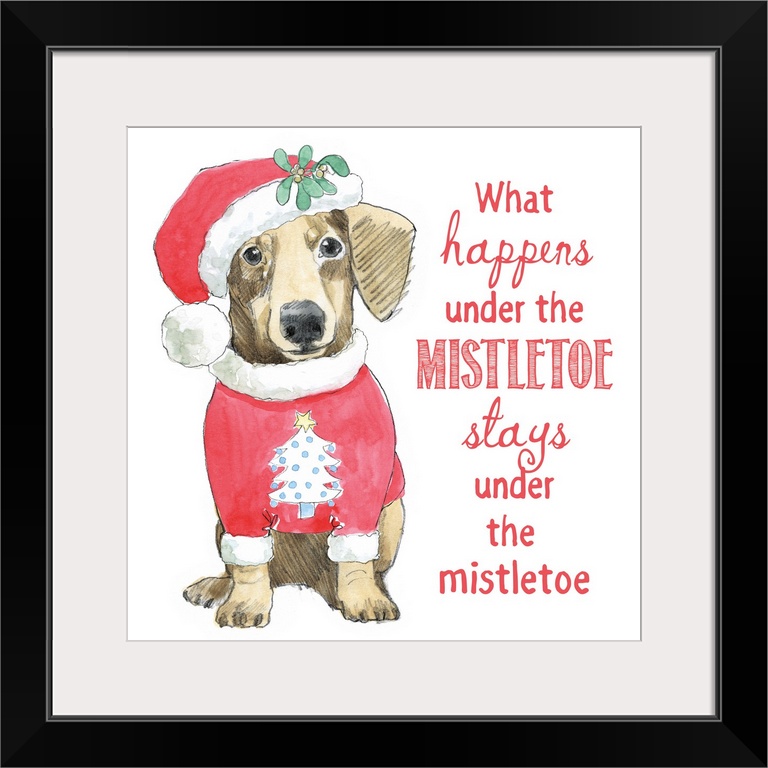<p>Square watercolor painting of a Dachshund wearing a Christmas tree sweater with a Santa hat that is decorated with mistletoe and the phrase "What Happens Under The Mistletoe Stays Under The Mistletoe" written on the side.</p>