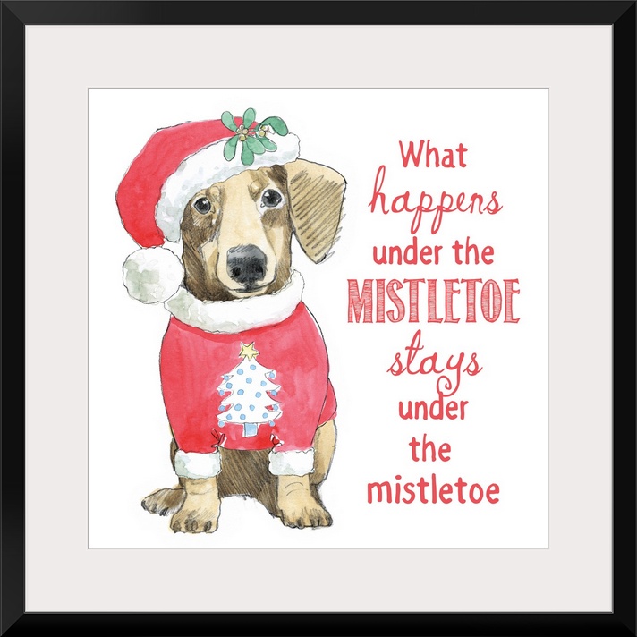 <p>Square watercolor painting of a Dachshund wearing a Christmas tree sweater with a Santa hat that is decorated with mistletoe and the phrase "What Happens Under The Mistletoe Stays Under The Mistletoe" written on the side.</p>