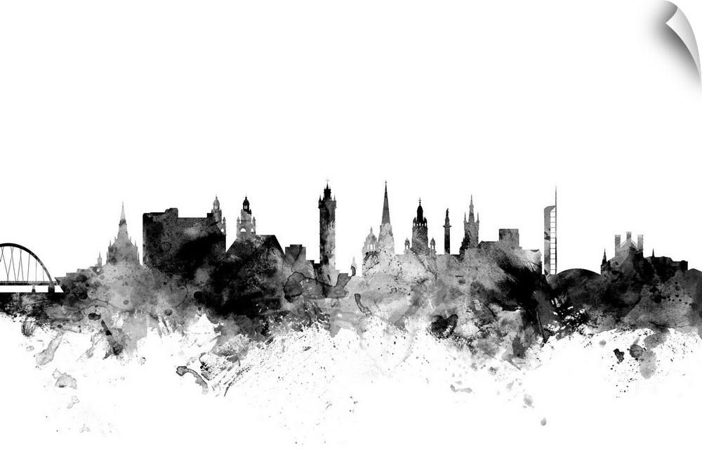 <p>Contemporary artwork of the Glasgow city skyline in black watercolor paint splashes.</p>