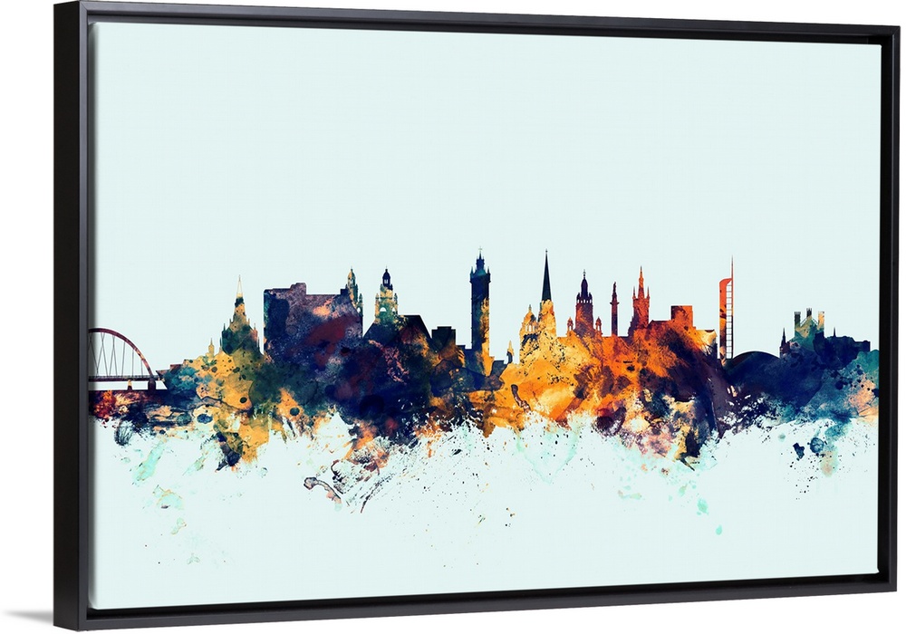 <p>Dark watercolor silhouette of the Glasgow city skyline against a light blue background.</p>