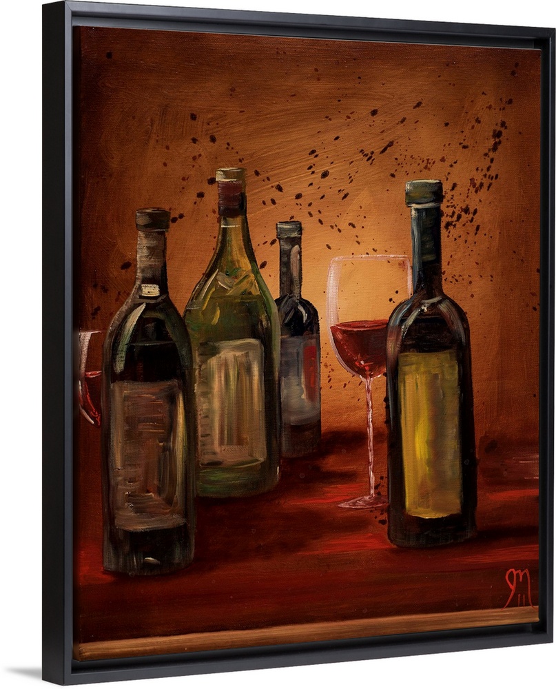 <p>Contemporary painting of wine bottles and a glass of red wine with a warm toned background and a little bit of paint splatter.</p>